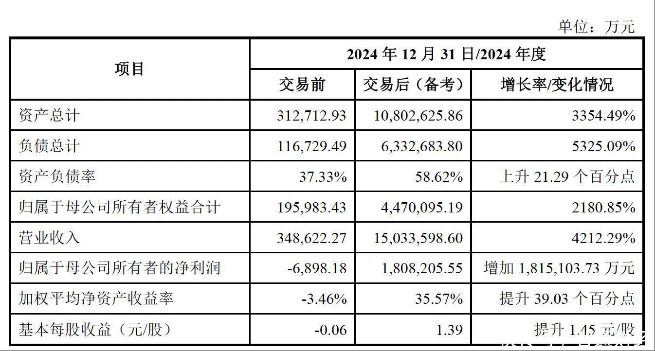 交易完成后,基于2024年的情况,宏创控股的总资产将从31.27亿元一举突破千亿至1080.26亿元,营收将从34.86亿元增加至1503.36亿元,归母净利润将由亏损转为盈利180.82亿元,净资产收益率将劲增39个百分点至35.57%,每股收益将从-0.06元提升至1.39元,堪称是全方位的“升级”。