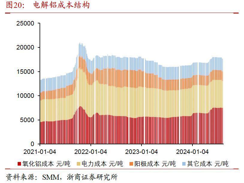 供应“天花板”压顶的情况,也意味着铝企想要获取超额利润就必须得在成本上做文章,而管控成本恰恰是“魏桥系”公司的传统优势技能。拆解电解铝成本结构,电力成本是其中的大头之一,据SMM数据,电力成本占总生产成本的比重约为32%。通过技术攻关,宏拓实业早已掌握了600kA特大型预焙阳极电解槽技术,电耗可较行业平均水平降低10%,吨铝成本优势可达15%-20%。
