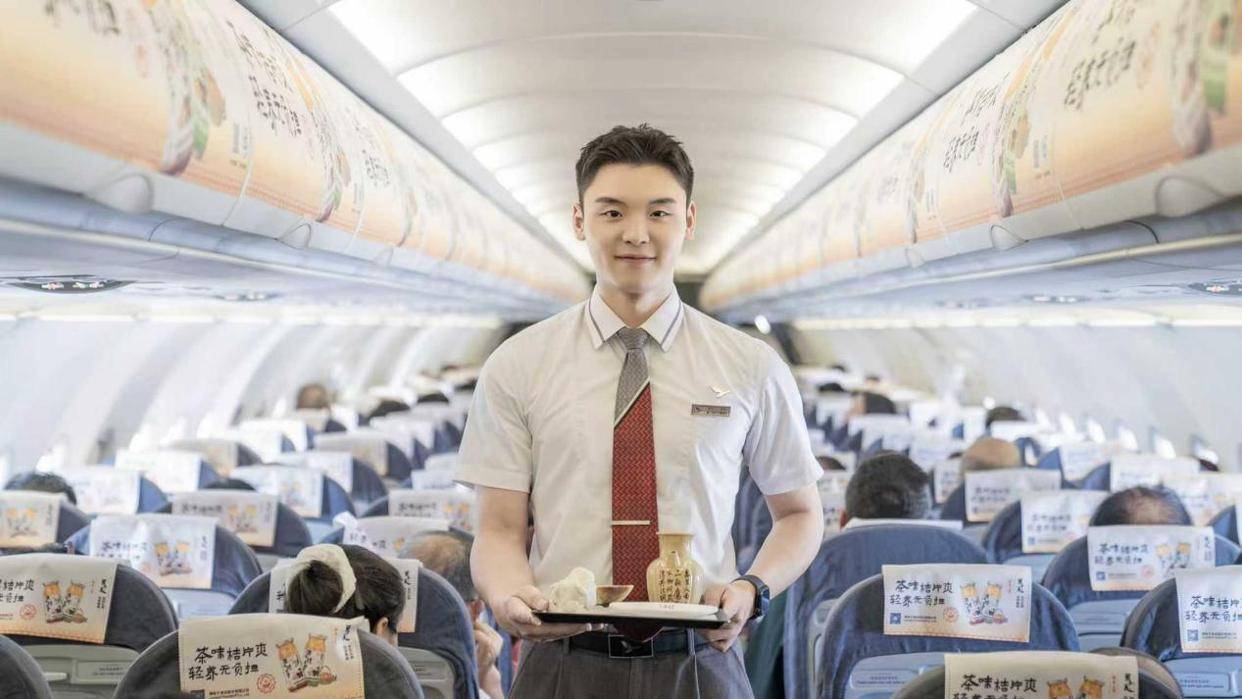 主题航班平飞阶段,乘务员司马烨通过机上广播,娓娓道来铜官窑釉下彩的历史渊源与工艺精髓:“釉下彩制作需经历揉泥、制坯、画坯、施釉、烧窑、开窑六道工艺,最终才能在釉层之下呈现永不褪色的彩绘之美。”