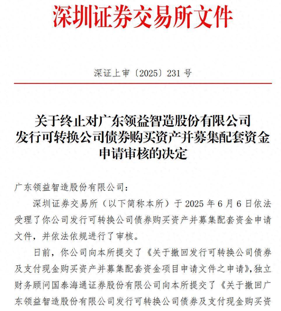 根据《深圳证券交易所上市公司重大资产重组审核规则》第五十二条的有关规定,深交所决定终止对领益智造发行可转换公司债券购买资产并募集配套资金申请的审核。